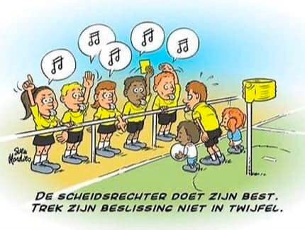 Dus laten we ons vooral bezig houden met het aanmoedigen van de teams door het publiek en het coachen door de coach. Zodat ook de scheidsrechter plezier heeft en krijgt aan het leiden van wedstrijden. Hij of zij is namelijk een onderdeel van het korfbalspel. En net als de spelers en coaches maakt de scheidsrechter wel eens een fout. En de scheidsrechters die de minste fouten maken fluiten op korfballeague-niveau en zo ver zijn wij (nog) niet.